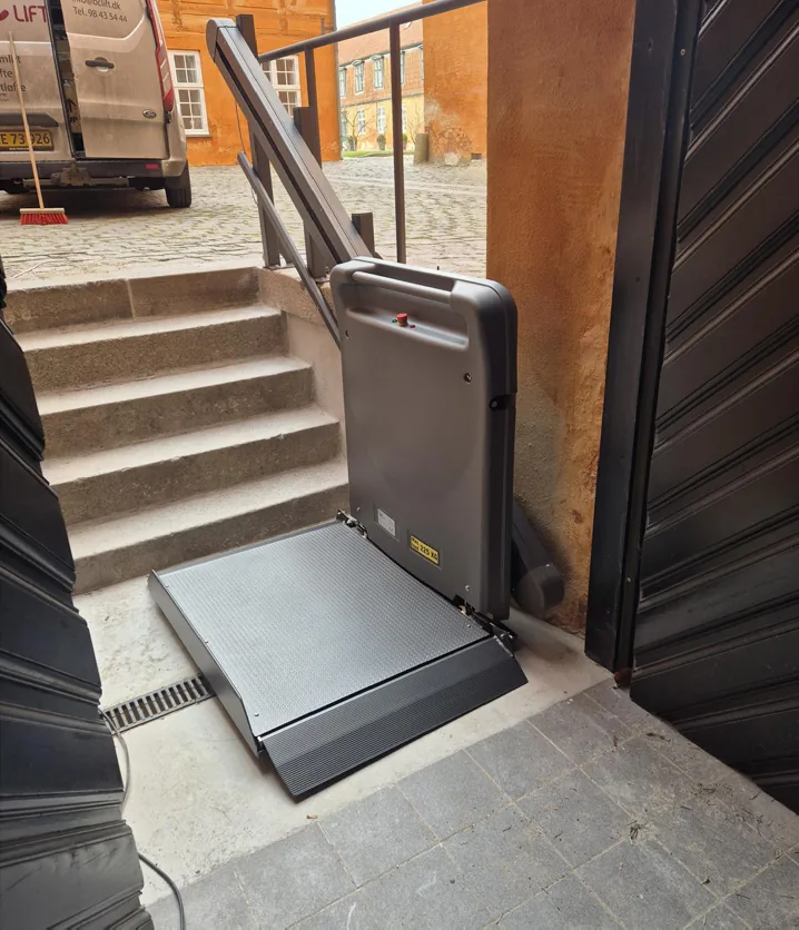 BC Lift A/S — referentie-installatie buitenshuis met goederen-traplift in gebruik